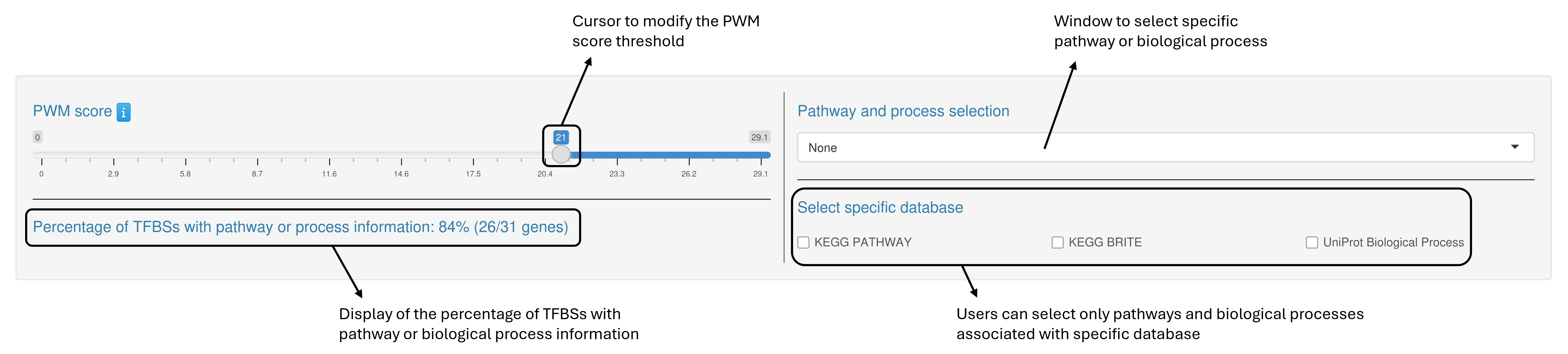 Customization Panel. It contains a slider to adjust the PWM score threshold and other filters to adjust the result output. All changes are applied in real time and immediately update the Interactive Barplot and Results Table. The percentage of TFBSs with pathway or biological process information is also displayed and updated according to the selected PWM score threshold. B. Interactive Barplot. A visual representation showing the number of genes that were found in each pathway or biological process. C. Interactive Result Table. The table lists all the pathways and biological processes linked to the predicted genes above the selected score threshold. Users can sort the table by any column and type in key words to look for specific results. There are also hyperlinks in the table connecting genes to their KEGG gene page.