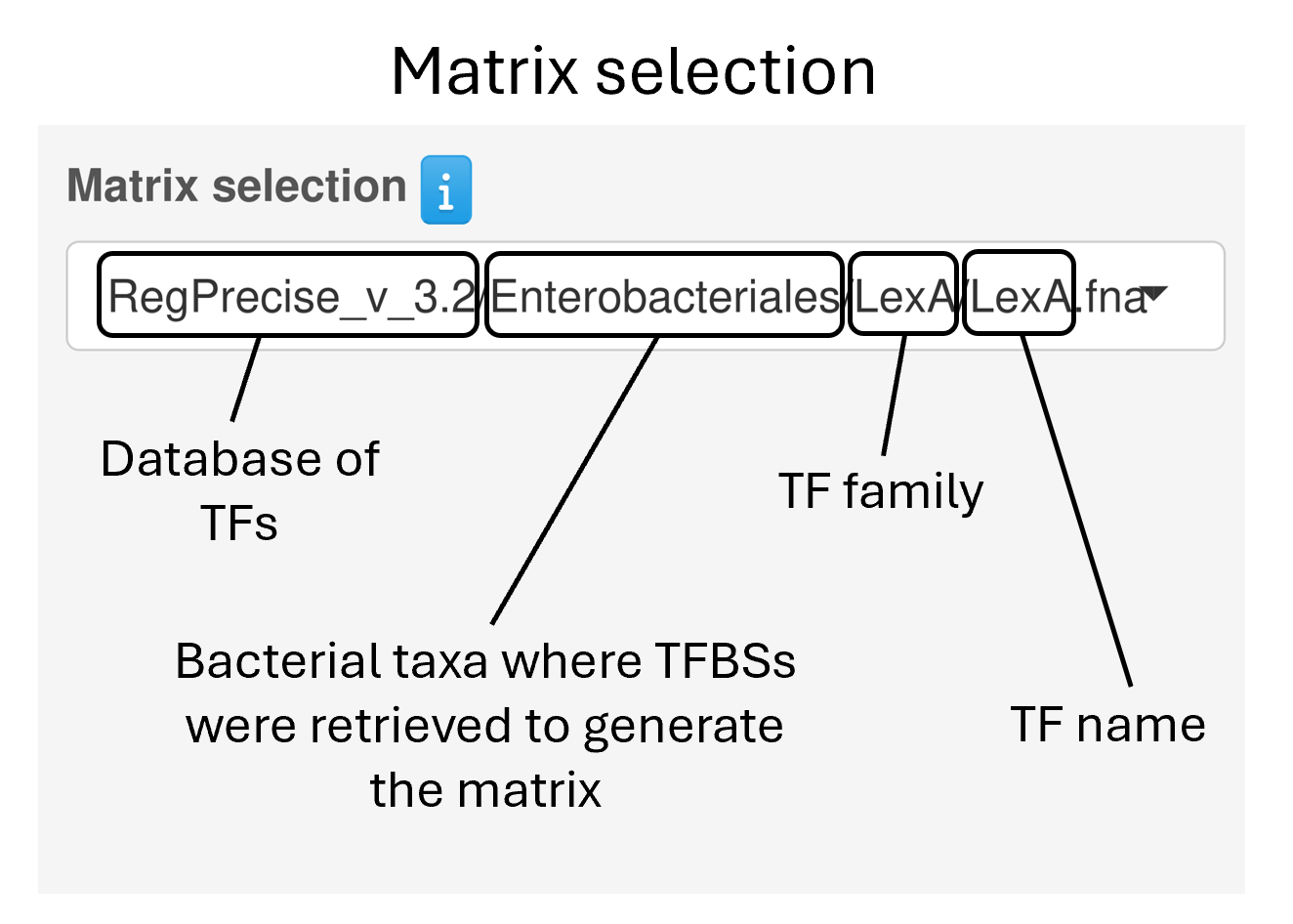 Users can choose a position weight matrix (PWM) for a transcription factor of interest from one of four databases: COMMBAT DB, RegPrecise, Prodoric, or Logomotif. These PWMs can be queried by: