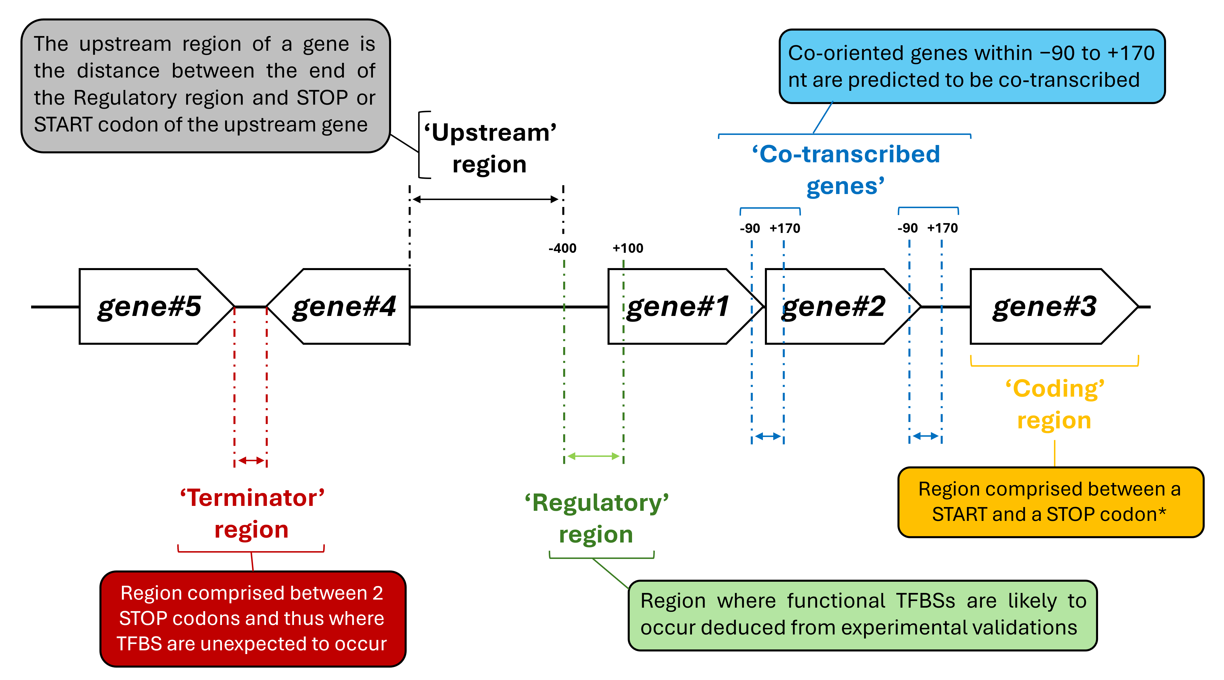 The regions and co-transcribed genes are defined as follows: