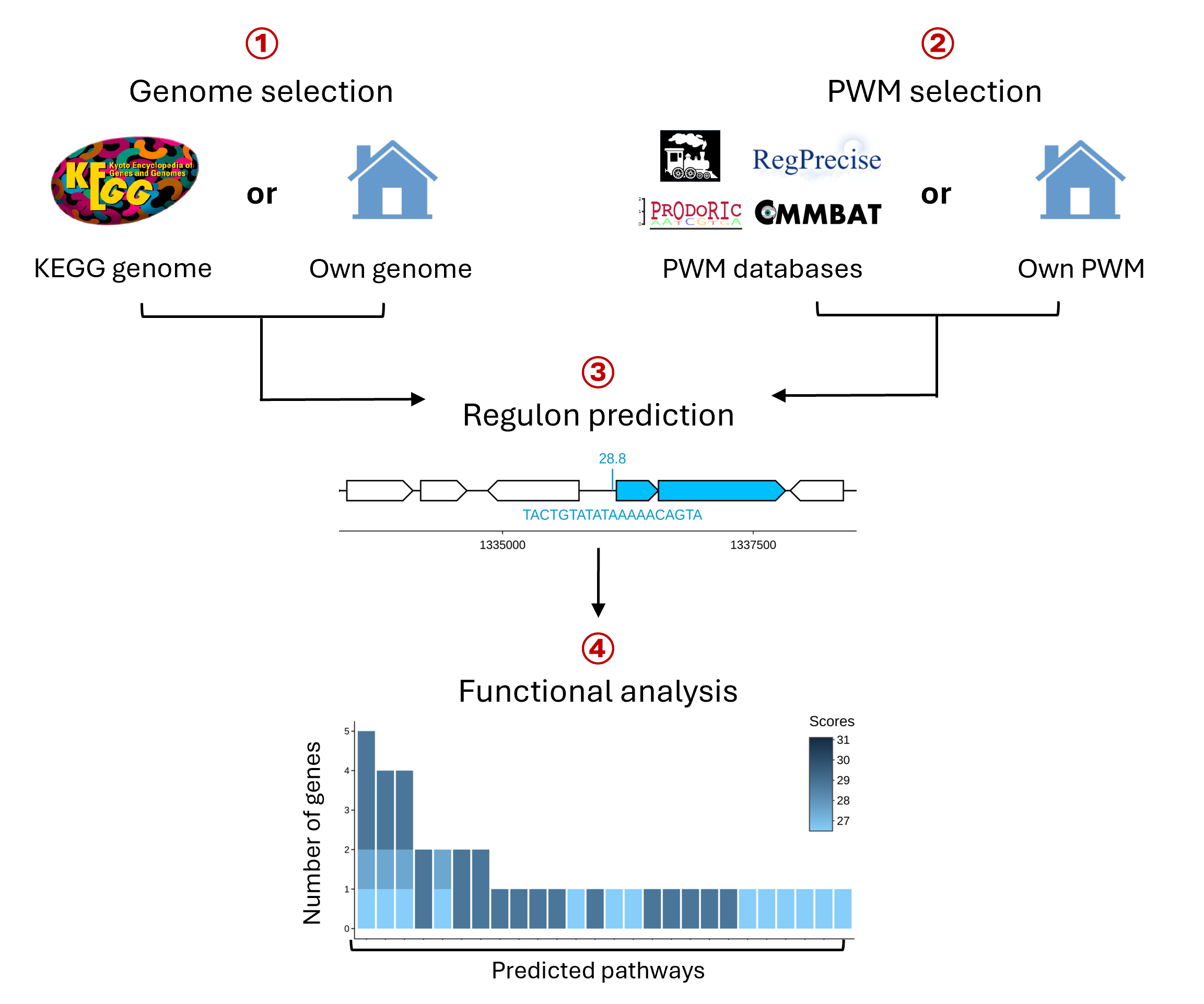 The PREDetector workflow consists of four main steps: (1) Genome selection; users either select a genome from over 9,000 KEGG bacterial genomes or upload their own bacterial genome files. (2) PWM selection; users either select a PWM from one of the four different databases or upload their TFBS sequence in FASTA format to generate their own PWM. (3) Regulon prediction; results are shown in an interactive mapping viewer and table, showing the genomic location of predicted sites relative to genes and the associated predicted co-transcribed genes. (4) Functional analysis; predicted target genes are analyzed for associated metabolic pathways and biological processes with results visualized in an interactive barplot and table.