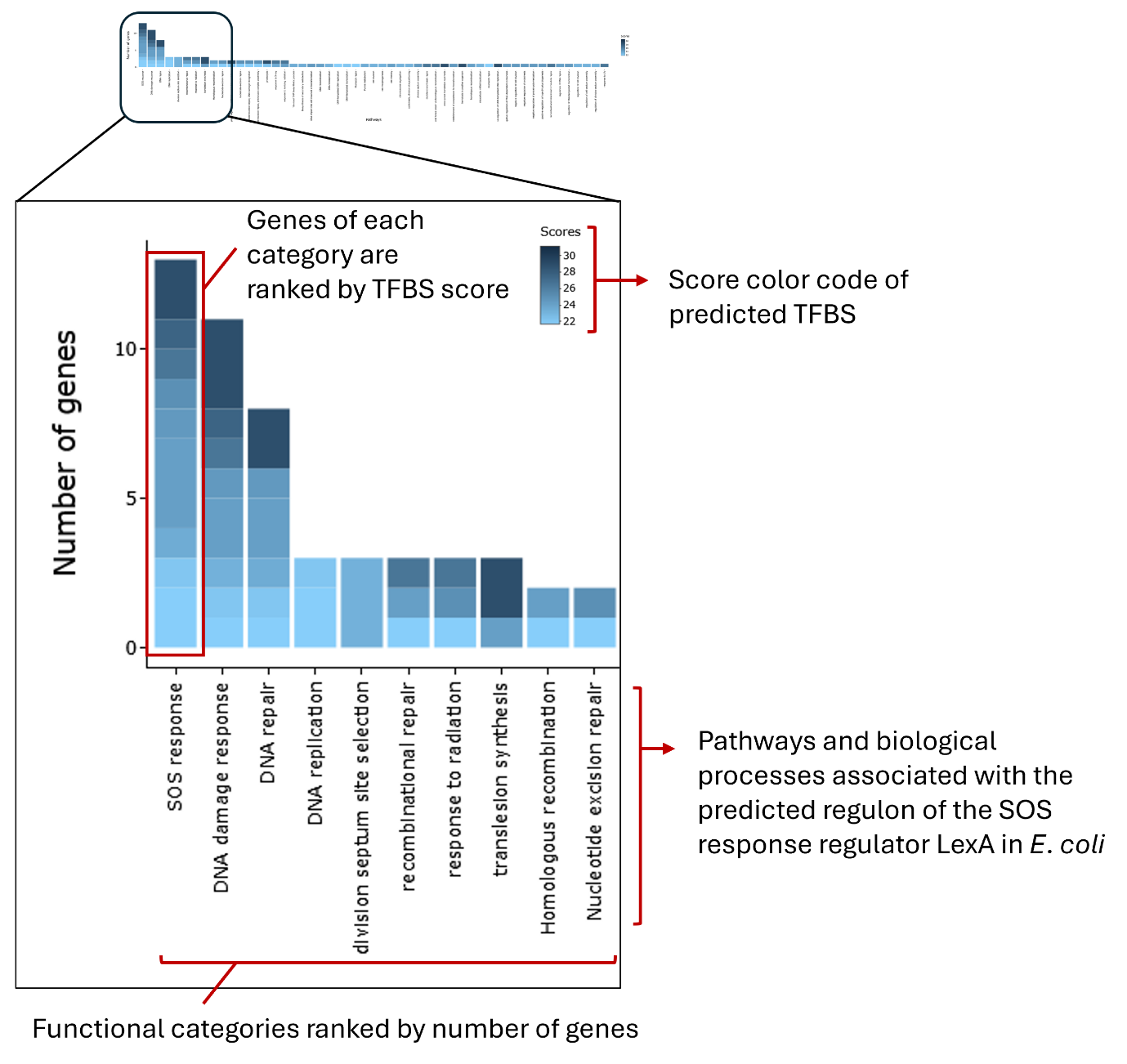 View of the global barplot, focusing on the most abundant pathways and biological processes linked to the predicted LexA regulon of