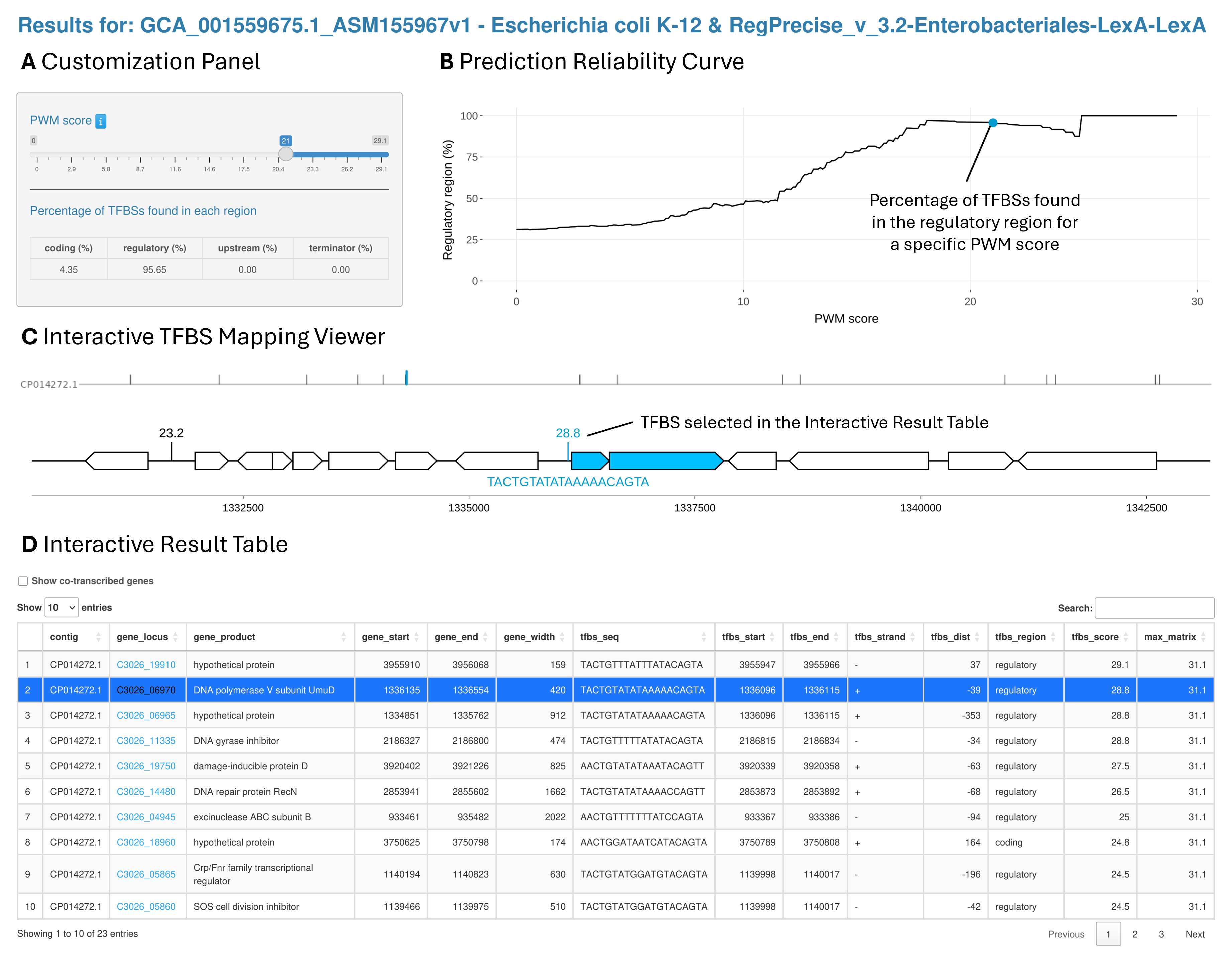 A. Customization Panel. It contains a slider to adjust the PWM score threshold, which is immediately updated in the Region Percentage Plot and Results Table. The percentages of TFBSs found in each region (coding, regulatory, upstream, and terminator) are also displayed and updated according to the selected PWM score threshold. B. Prediction reliability curve. A plot representing the percentage of TFBSs found in the regulatory region (-400 to +100 nt) depending on the TFBS score. C. Interactive TFBS Mapping Viewer. An interactive representation of the genetic organization around the selected TFBS from the Interactive Result Table. D. Interactive Result Table. The table lists all the predicted TFBS above the selected score threshold. Users can sort the table by any column and type in key words to look for specific results. There are also hyperlinks in the table connecting predicted target genes to their KEGG gene page.