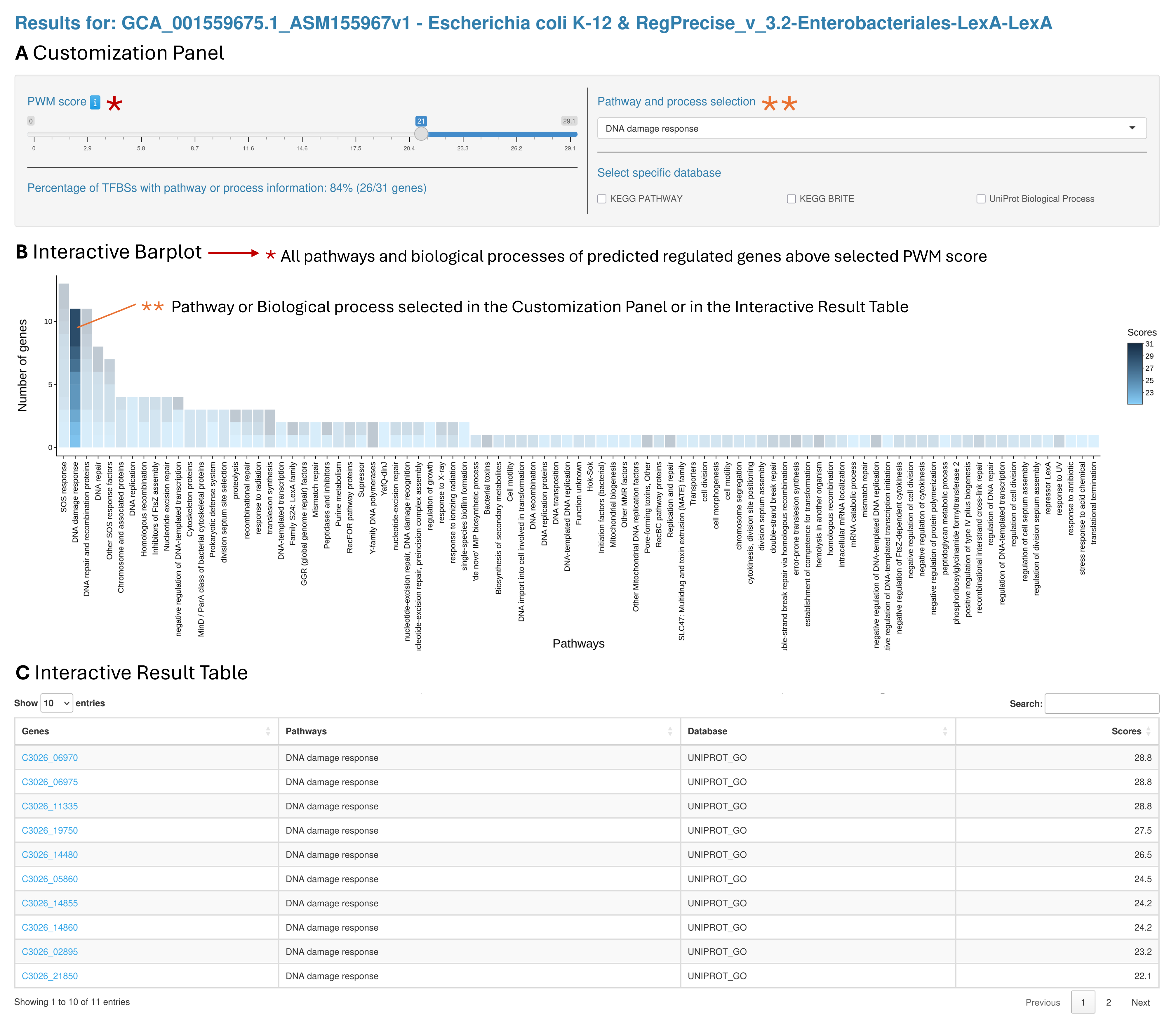 Customization Panel. It contains a slider to adjust the PWM score threshold and other filters to adjust the result output. All changes are applied in real time and immediately update the Interactive Barplot and Results Table. The percentage of TFBSs with pathway or biological process information is also displayed and updated according to the selected PWM score threshold. B. Interactive Barplot. A visual representation showing the number of genes that were found in each pathway or biological process. C. Interactive Result Table. The table lists all the pathways and biological processes linked to the predicted genes above the selected score threshold. Users can sort the table by any column and type in key words to look for specific results. There are also hyperlinks in the table connecting genes to their KEGG gene page.