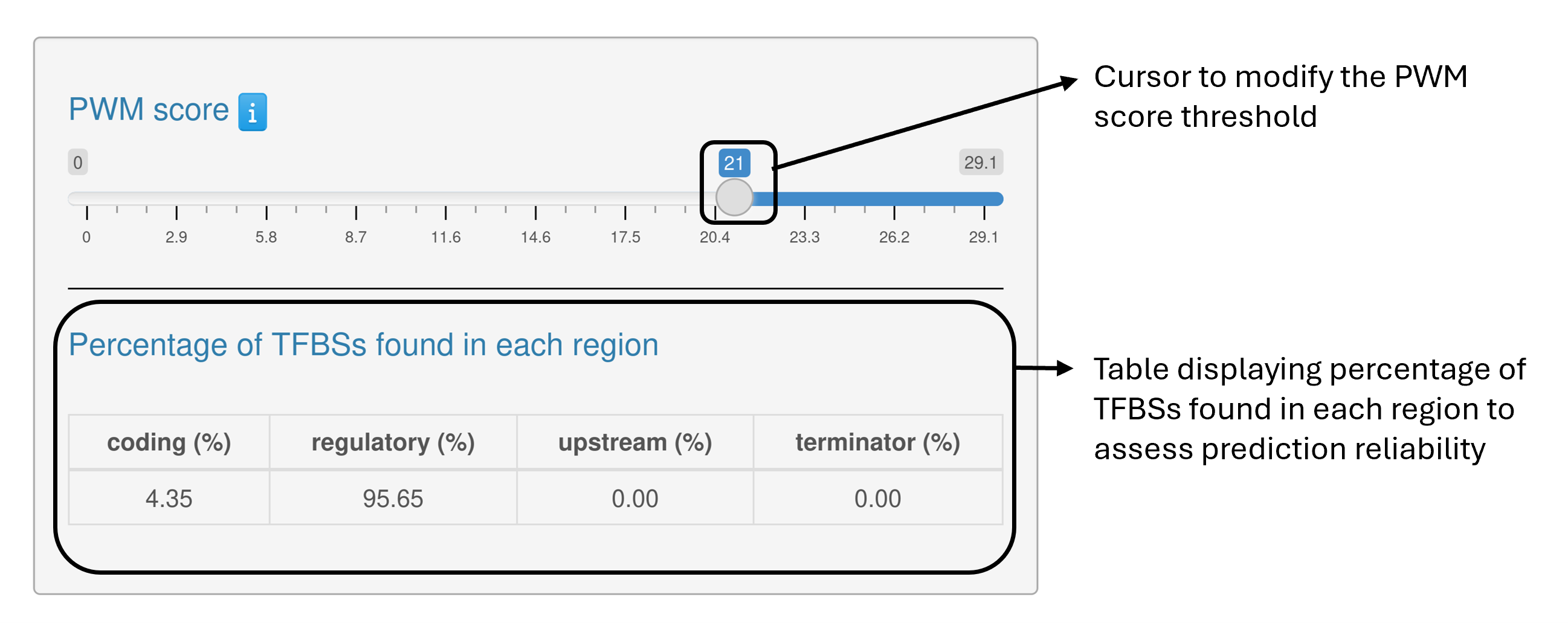 Selection of a transcription factor PWM, either from one of four available databases (RegPrecise, LogoMotif, Prodoric, or COMMBAT DB) or by providing an user-defined PWM in FASTA format.